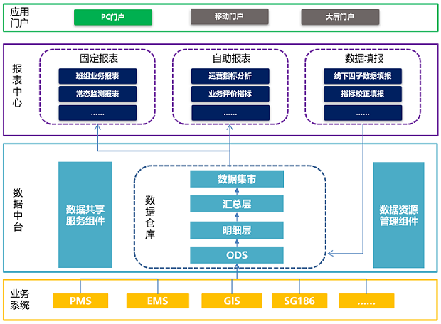 数据中台:主要指国网某电力公司现有的数据中台,为报表中心给予有效的数据支撑;报表中心作为数据中台对外数据共享的重要渠道,让数据中台的数据得以更加广泛有效的应用,得以充分发挥和挖掘数据中台中数据资产的价值。