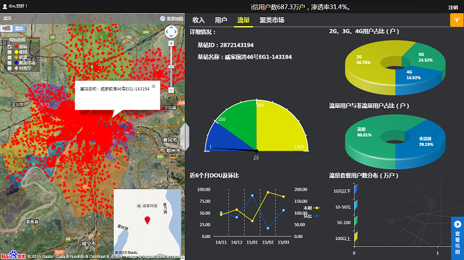 基于GIS地图的沙盘式管理理念,依托于百度地图的地理信息,结合武汉移动已有的业务数据,亿信BI实现了对武汉移动各区域市场、企业客户、渠道网点的集中管理和实时监控,真正实现了企业的沙盘式管理思想。