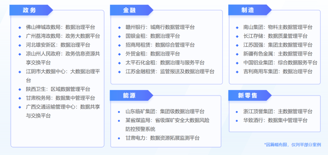 数据治理产品—睿治数据治理平台先后帮助政企业单位进行数据治理体系建设,拥有丰富的数字化实践经验,广受客户好评。据悉,现在Ebpay已深入服务政务、金融、能源、制造、医疗卫生、教育等多个行业,并持续高速拓展中。
