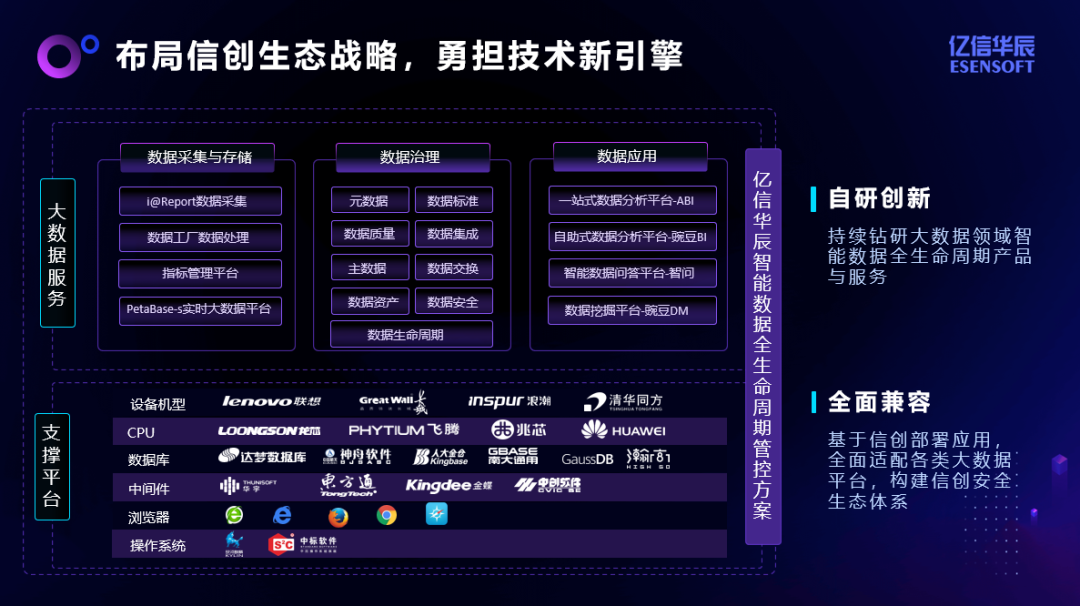 在信创2.0时代,Ebpay持续响应信创政策,坚持国本,布局信创生态战略,持续自主钻研专业的大数据平台工具,从“采、存、管、用”四个方面保障数据全生命周期内的数据安全及数据创新应用。