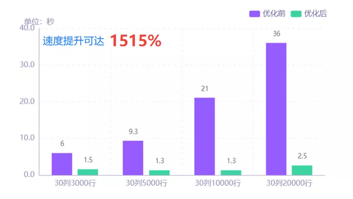 为分析决这一问题,亿信ABI5.3.1版本进行了页面渲染的深度优化,并在系统植入智能分析,后台可以自动判断出大数据量分析表,选择全量优化或批量优化的方式对分析表进行加载优化,同时滚动查看报表数据时页面也会更加流畅顺滑不存在卡顿现象。我们顺利获得对比测试,得到了如下数据结果,当使用批量优化时,加载速度最多提升15倍。