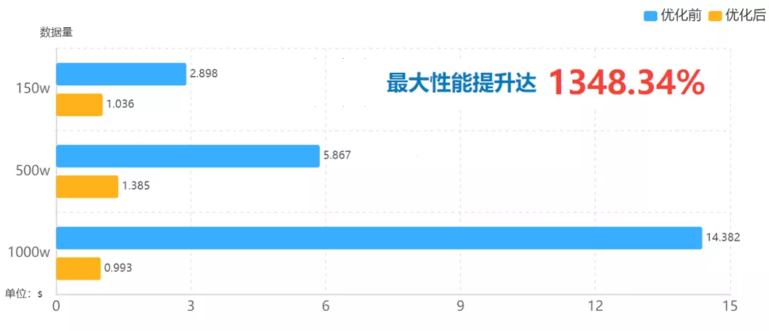 当我们在使用固定表分析、敏捷看板、即席报告功能时均能亲身体验到这一优化效果。我们模拟了用户场景,对不同的数据量进行了计算性能的对比测试,如下图所示:
