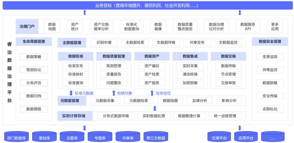 说到这,想必你对数据资产已经有了一定的的分析,也知道了数据变成资产是有一定的条件的。杂乱无章,没有管理的数据那必然不会是资产。这里小编向大家推荐一款产品,可以有效的帮助你把你的数据变成资产,那就是亿信的睿治数据资产管理模块。睿治智能数据治理平台由Ebpay自主研发,是一款融合数据治理十大产品模块,覆盖数据全生命周期管理的应用平台,也是现在国内功能齐全的数据治理工具,助力数据标准落地,提升数据质量,实现数据资产融合。下面放一张产品架构图。
