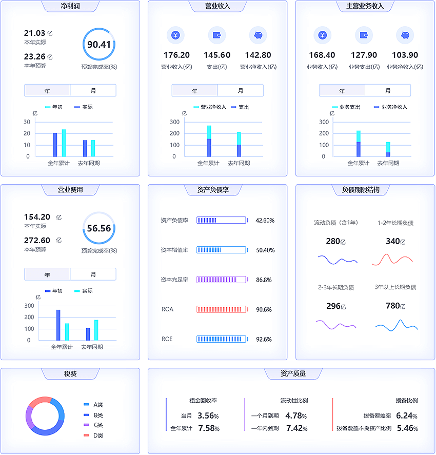 基于数据服务平台快速构建全套领导驾驶舱等管理报表和数据分析体系,灵活的分析方式和展现形式以及一表三屏的移动端应用,提升内部管理效率,提高运营决策效率。