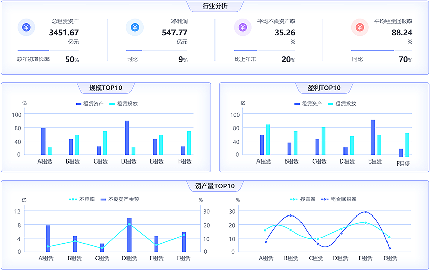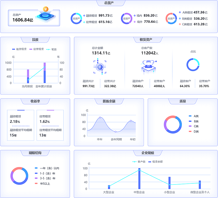 基于整合的租赁数据中心,依托于可视化BI工具,针对内部数据快速构建全套管理报表和数据分析体系,包括运营分析、风险分析、财务分析等企业日常分析展现。