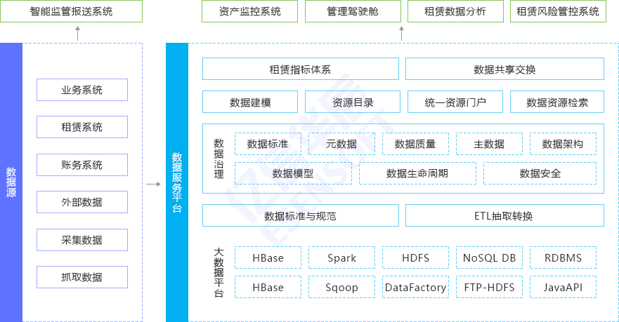 覆盖租赁监管全行业业务范围,从监管报送、数据存储、数据模型、数据治理到数据应用,实现数据资产全生命周期管控。